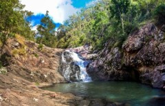 The walk starts to the right of the Cedar Creek Falls lookout, sloping down gently. Upon reaching a fork, keep to the left to reach another viewing platform. Rest to take full advantage of the breathtaking views of the three upper waterfalls and rock pools (86 stairs). Continue until the two tracks re-join, and zig-zag down the canyon through open forest and dry rainforest and arrive at these popular swimming holes after crossing extensive jumbled rock scree slopes (17 stairs). Access to the swimming holes is easy via slope rock shelves, but care needs to be taken as these rocks can be slippery. The return track reverses the walk-in, except when coming to the fork, stick to the left to shorten the uphill walk and to arrive back at the upper viewing platform (37 stairs).