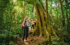Today's trail covers approximately 16 kilometers and includes a variety of Grade 3, Grade 4, and Grade 5 trails. The day begins with a relatively flat warm-up along an access road, where you'll be serenaded by the sounds of rainforest birds. Be prepared for potentially muddy conditions on this initial stretch, which may require some careful navigation around puddles. As you descend into the valley, you'll find yourself surrounded by the lush, dense rainforest. About half of today's hike is on Grade 5 trails, with your guides expertly leading the way through unmarked paths. The descent includes sections of rocky boulders that will require slow, careful navigation. The pace will be more deliberate as you traverse tree roots and rocky terrain, ensuring your safety and footing. The final section of the day involves a climb up to Spicers Timber Getters Ecocamp, where your hosts will be waiting to greet you. Though the camp's architecture mirrors that of previous camps, each one boasts its own unique interior and exterior style. Spicers Timber Getters Ecocamp was once a loggers' camp, and you can still see the old tin cabin that housed the timber getters of that era. As the day winds down, gather in the lounge for your daily briefing before enjoying a delicious dinner at 6:00 pm. Afterward, unwind with a glass of port or Baileys, savoring the tranquility of the surroundings before retiring for a well-earned night of restful sleep.